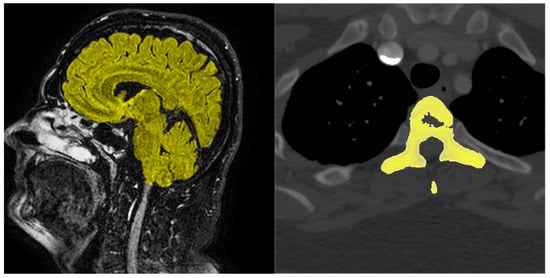Example of MRI sagittal brain scan slice (left) and CT transversal thoracic scan slice (right)—tissue segmented with our system is highlighted in yellow.