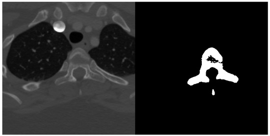 Example transversal image slice from spine dataset (left) with according ground truth mask (right).