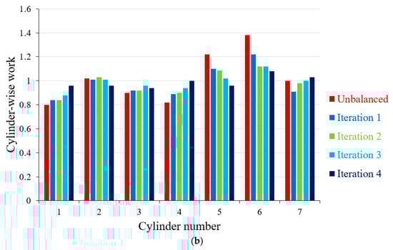 Normalized cylinder-wise torque integrals in power balancing results: (a) simulations; (b) actual test on a medium-speed 7-cylinder diesel engine [9].