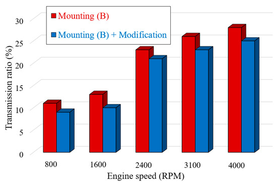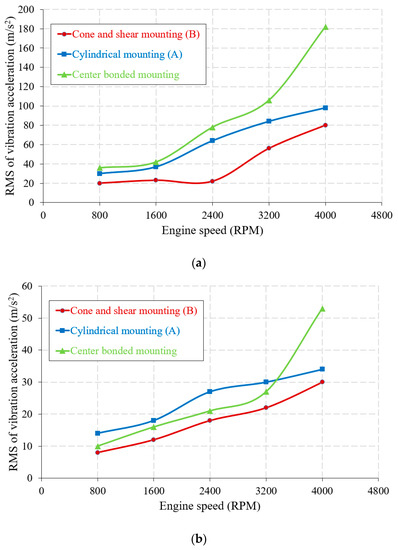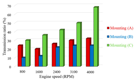 Mohamed et al. [14] performed time- and frequency-domain analyses on a 4-cylinder engine, running at 800–4000 rpm, to evaluate the vibration isolation and transmissibility of three rubber engine mountings (REM), including cylindrical (A), cone-and-shear (B), and center-bonded mounts (C). They concluded that a cone-and-shear system offers the minimum RMS of vibration accelerations (Figure 2) and optimum transmission ratio when it is mounted on the engine and chassis (Figure 3).