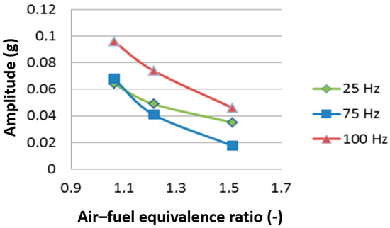 Here, means that no combustion occurred in the chamber and the engine was actuated only by the asynchronous machine. As shown in Figure 5, the amplitudes tended to drop with increasing the ER function (% O2). In other words, the vibration components decreased by degradation of the air–fuel mixture, i.e., the step-by-step garbling of the perfection of the combustion.
