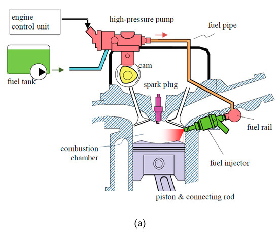 Schematics of (a) gasoline direct injection fuel system; (b) rail isolation and injector suspension [23]. Figures are reprinted with permission from publisher.