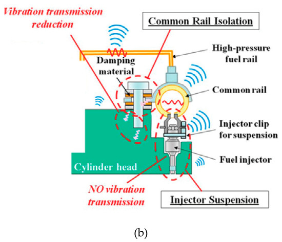 Borg et al. [23] investigated mitigation of noise and vibration in a direct injection gasoline (DIG) engine by optimizing the geometry of its high-pressure fuel pump, without affecting the fuel consumption and emissions of the engine. Figure 6a illustrates schematic of a typical DIG, composed of different components. Fuel system, the heart of the DIG, contains a high-pressure fuel pump, fuel pipes, and injectors. It is considered as the main source of noise generation in the DIG engines. Since the pump and injectors are typically solenoid-actuated, the vibration can be reduced or diminished if accurate design and control modifications are applied to the system. For the former, vibration damping could be improved by applying changes to the fuel rail/cylinder head and injectors/cylinder head mountings. Hence, those researchers sandwiched a rubber isolator between the fuel rail clips and cylinder head, to isolate the system noise and eliminate the vibration transmission path to the cylinder head (Figure 6b). Furthermore, the cylinder head vibrations were suppressed by suspending the injectors from the fuel rail, providing no mechanical contact between the components. Also, they were able to attenuate the compression (at outlet) and ticking (at inlet) noises of the solenoid (up to 5 dB), using soft-landing and pulse-skipping control techniques, respectively.