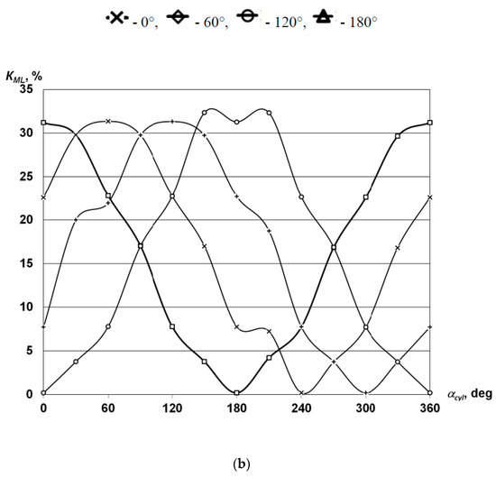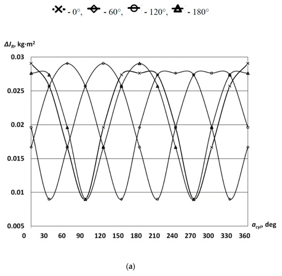 Figure 8 depicts the amplitude of balancing moments of inertia and coefficient of mechanical losses for . Each curve exhibits the dynamic behavior with respect to the angle between the cranks , ranging from 0° to 180°. As can be seen in Figure 8a, the maximum amplitudes of the moment of inertia occurred at = + 0° or ± . This horizontal layout could be used for applications where the engine is expected to endure high mechanical losses and stresses. On the other hand, they showed that by defining the optimum angle of the crankshaft as = 90°, cylinders generate less longitudinal (horizontal) vibrations. This finding is of particular interest in aviation applications where high-speed ICEs, such as aircraft, are required to attenuate the vibrations aroused by high dynamic loads.