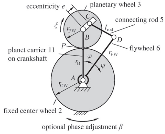 To meet the requirements mentioned above and expand the compatibility of their transmitting mechanism to ICEs with single/multiple-cylinders, those researchers also developed a geared double-crank mechanism () with cycloidal-crank input () to couple the flywheel () to the crankshaft () (see Figure 10). The amplitude of the non-uniformity of the kinematic transfer function, , was adjusted by the eccentricity () of the input crank. The topology of this mechanism enabled generating high relative accelerations, between the crankshaft and flywheel, and triggered high amplitude compensating torques, at a four-stroke three-cylinder inline diesel engine, under full load at 2000 rpm.