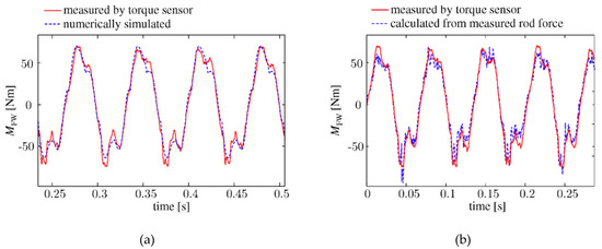 Figure 11a represents that the correlation between measured and simulated had a good agreement at 600 rpm and 4 mm eccentricity. The close agreement between the compensated torque, measured from forces in the connecting rod and values measured directly from the experiments, assured the consistency of the measurements (Figure 11b).