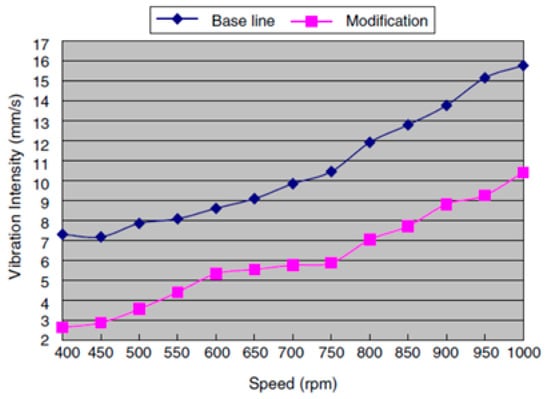 The research was aimed at applying structural modifications to reduce noise and optimize vibrations at the engine, while operating at 400–1000 rpm, under full load, and in low-frequency range of <1 kHz. Whereas the FEA was conducted to analyze the vibrational behavior of the housings and crank train/valve drive of the engine, the MBA was utilized to model the dynamic behavior of rotating components (e.g., transmission shafts, gears, timing drive, etc.) and simulate vibroacoustic responses of the whole system. Forced vibration calculations were performed in the time-domain, under various speed and load conditions. The simulations were carried out in a direction perpendicular to the engine surface, to obtain rpm spectral maps at different vibration levels. Results discerned that most of the engine surface vibrations were induced at a range close to the natural frequencies of the crankshaft, and at a speed between 600 to 1000 rpm. To minimize the vibration transferred through the internal paths and enhance the structural stiffness of the engine, two major design modifications were proposed: (i) increasing the local wall thickness of the crankcase, front gear cover, and back flywheel cover; (ii) adding ribs (extra mass of 14.85%) to the drive shaft of the engine which added extra supports for the drive shaft bearing bracket and more stiffness to the oil sump. Figure 13 demonstrates that the modifications reduced the vibration intensity of the original design for the modes between 0 to 1 kHz.