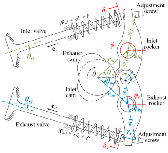 Lin et al. [34] synthesized a novel balancing cam mechanism for a single-piston engine to passively compensate resistive torque fluctuations of an engine camshaft at all positions and speeds. The camshaft was comprised of inlet and exhausted cams, each separately connected to a set of rocker, valve, and spring (see Figure 15). Three major assumptions were made in analysis of the camshaft torque: (i) the inlet and exhaust springs had identical geometry, stiffness (, and preload ; (ii) the engine was well-lubricated and frictionless; and (iii) the rollers were treated as two massless two-force members, with the contact force applying to their centers.