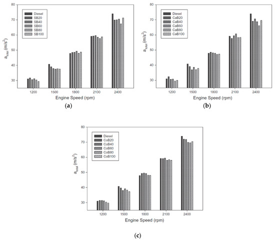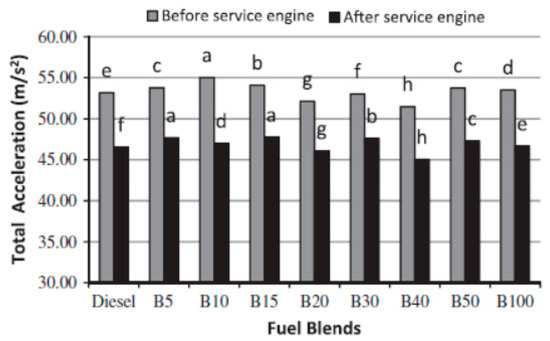 Total vibration acceleration () of different diesel–biodiesel fuel blends, before and after the service engine [57]. Figure is reprinted with permission from publisher.