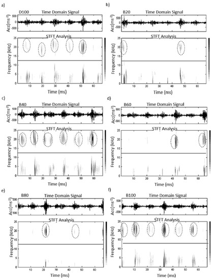 The short-time Fourier transform (STFT) analysis of vibration signals of the six-cylinder engine, running under the full-load condition at 1800 rpm, for different biodiesel–diesel fuel blends [60]. Figures are reprinted with permission from publisher.
