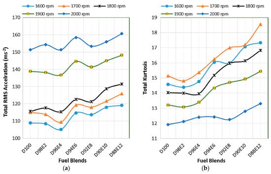 Taghizadeh-Alisaraei et al. [57] investigated the effect of different diesel–biodiesel blends on performance and vibration characteristic of a 6-cylinder diesel engine running at 1000–2200 rpm. Nine fuel blends were studied: B0D100 (pure petrodiesel), B5D95 (5% biodiesel + 95% diesel), B10D90, B15D85, B20D80, B30D70, B40D60, B50D50, and B100D0 (pure biodiesel). The biodiesel fuels were prepared from vegetable oil, animal fat, and waste oil, according to ASTM D6751-09 standard. The combination of the fuel blends and engine speeds generated several experiments. Time- and frequency-domain vibration analyses were conducted at various engine speeds. The RMS of acceleration for each experiment was calculated: