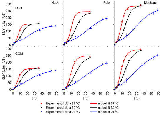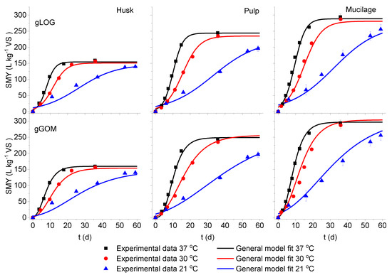 | Substrate | Dig. Temp (°C) | Model | S (L kg−1 VS) | Rm (L kg−1 VS d−1) | λ (d) | SMY estimated (L kg−1 VS) | Goodness of fit | |