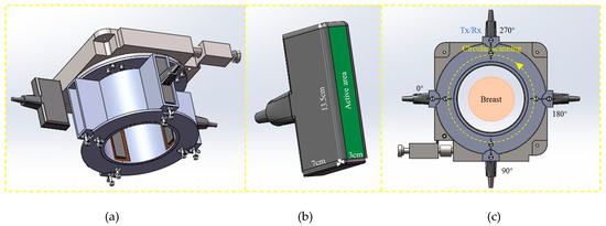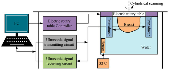 Breast cancer is one of the most harmful diseases to women in today’s society. Therefore, early detection and early treatment of breast cancer is particularly crucial [1]. The breast is made up of breast glands and other soft tissues without bones, which the cancerous tissues have higher density [2,3]. In order to avoid the harm of false positive to women, it is necessary to develop highly sensitive and specific diagnostic tools for early detection of breast cancer [4]. At present, the imaging technology for breast cancer mainly includes X-ray mammography, Magnetic resonance imaging (MRI) and ultrasound [5]. X-ray mammography has the advantages of high sensitivity and high specificity to calcification points [6]. Whereas, early lesion is small, similar to the density of surrounding glands and the boundary is not clear, hence the imaging effect in breast detection is not obvious [7]. Besides, because of the radiation hazards, early screening is not appropriate [8]. Although MRI has higher sensitivity, the specificity is rather poor [9]. In addition, its disadvantages are high costs and long inspection time, which is not conducive to early screening [10,11,12]. Likewise, breast ultrasound relies heavily on the doctor’s interpretation and is often used as a supplementary tool [13,14]. In general, biopsy is the gold standard for the diagnosis of breast cancer, which show that there are a lot of false-positive cases diagnosed by ultrasound imaging [15,16,17,18]. Ultrasound computer tomography (USCT) is a potential candidate for the imaging of breast cancer [19,20]. The simultaneous recording of reflection, speed of sound and attenuation images is the key superiority of the USCT system [21]. Comfort, safety and 3D imaging are the potential clinical benefits of ultrasound tomography [22,23].