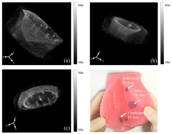 In this section, multi-perspective ultrasound imaging was realized with the cylindrical motion of the linear arrays and the experimental setup was built as shown in Figure 7. The system description is described in Section 2.1. The breast model is made of similar to the mammary gland material, close to the hardness of soft tissue and can be used for ultrasound imaging research. The model with a 2 cm mass in the center and six 1-cm superficial masses were used for experimental analysis as shown in Figure 8d. The breast model size was 15.5 cm × 8 cm. The test was carried out in the water tank and the working temperature was constant at 32 °C. The sound velocity was 1520 m/s and the maximum detection depth was 17.8 cm. The PMUT’s center frequency was 3.5 MHz and the element spacing center to center was 1 mm. The 64 channel ultrasonic signal acquisition circuit was used to realize the point-by-point dynamic focusing, where the sampling frequency was 40 MHz. The breast model was placed through the detection window. The rotation interval was set to 2 degrees. When the rotation was 90 degrees, the cylindrical scanning was completed. Hence, 180 × 256 A-scan lines were obtained. These scan lines were analyzed from multiple perspectives according to the algorithm described in Section 2.2 and the results are shown in Figure 8, Figure 9 and Figure 10. The experimental setup (Figure 7a) can be encapsulated into the detection bed as shown in Figure 7d, which will be used for clinical imaging research in the future.