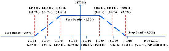 To further analyze the valid DTMF tones in ITU specification, an example of tone detection at a frequency of 1477 Hz with a sampling rate (SR) of 8000 Hz and a DFT size of 512 is illustrated in Figure 2. In this case, frequencies over the range of 1455 to 1499 Hz must be accepted, whereas those below 1425 or beyond 1529 Hz must be rejected. Hence, tone detections must be performed over the frequency bin k = 92 to 97.