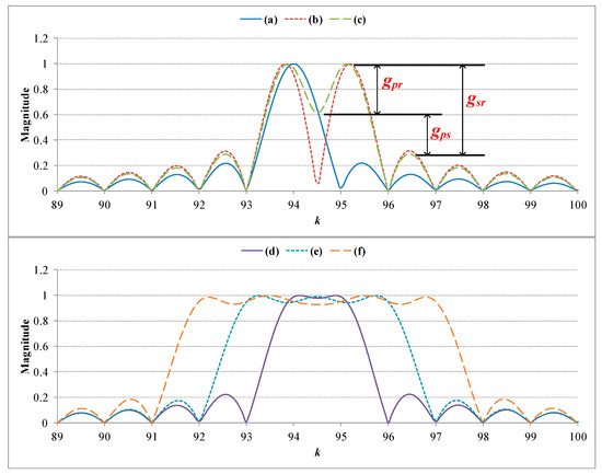 As a target of this paper, the phase angle θ is then tuned so as to optimize the frequency response of a detector. As illustrated in Figure 4c, gpr denotes the pass-band ripple of the frequency response, gsr the maximal ripple of the stop-band, and gps = gsr − gpr the differential gain between the pass- and the stop-bands. In a bid to optimize the frequency response of a detector with respect to the phase angle θ in (5), a cost function in the determination of the optimized phase angle θopt is defined as