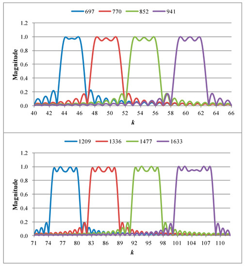Dual-tone multi-frequency (DTMF) signals [1,2,3,4] were developed by Bell Labs for the purpose of automatic fulfilled long-distance calls. DTMF signal and the detection of DTMF have been widely used in modern communication systems. In a public switched telephone network (PSTN), the DTMF technique is applied to telecommunication signaling over analog telephone lines in the voice-frequency band among telephone handsets, other communications devices, and a switching center. Recently, the DTMF technique has also been widely applied to household intelligent alarm systems [5], remote control systems [6,7], VoIP systems [8], and so on.