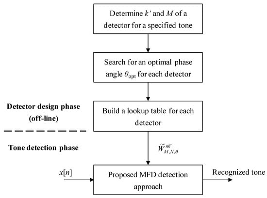Finally, a lookup table is built for a quick reference of (i.e., wr(n) and wi(n)) at various tone frequencies, and, thus, eliminates repeated computations. As a one-point DFT algorithm does, this proposal requires 2N and (2N − 2) number of multiplication and addition operations, but merely requires a one-time detection computation to complete a DTMF detection task. As a consequence, the single point detection disadvantage, a problem that a typical DFT and a Goertzel algorithm have in common, is resolved. In simple terms, this proposal, as a high-performance algorithm, results in a tremendous computational load reduction. The proposed detection approach is illustrated as a brief flowchart in Figure 6.