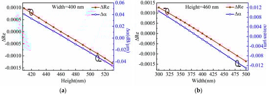 Difference of the real- and imaginary-part of effective refractive index between TE and TM modes in the case of different waveguide widths (a) and heights (b).