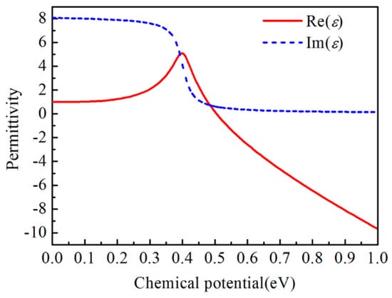 The permittivity of graphene εg is related to the optical conductance σ by εg = 1 + i·σ/(ωε0Δ). Figure 3 shows the permittivity of graphene as a function of the chemical potential μc, in which Δ = 0.7 nm stands for the single layer graphene’s effective thickness. As shown in Figure 3, graphene’s permittivity gets close to zero when the chemical potential (μc) is around 0.5 eV, and the point is called the epsilon near zero (ENZ) point. In our simulation, the typical parameters are λ = 1550 nm, T = 300 K, τ1 = 1.5 × 10−14 s and τ2 = 1.2 × 10−12 s [].