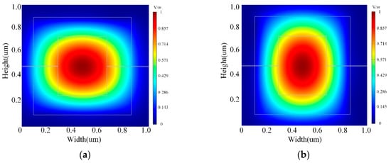 For a polarization-insensitive waveguide, the real-part difference of an effective refractive index between TE and TM modes (ΔRe = Re(neff_TE) − Re(neff_TM)) should be less than 5 × 10−4 [], and the insertion loss difference between TE and TM modes (Δα = α(TE) − α(TM)), which results from the imaginary-part difference of the refractive effective refractive index between TE and TM modes, should be less than 4 × 10−3 dB/μm [,,,], such as the polarization sensitive < 1 dB with the waveguide length of 250 μm (i.e., 4 × 10−3 dB/μm) []. The insertion loss can be calculated with α = −40πlge·Im(neff)/λ. The outer waveguide around the small one enhances light-graphene interaction which is the key design element for achieving effective electro-optic modulation. In the horizontal and vertical directions, the light in the waveguide is influenced by the graphene, to make sure that the waveguide is polarization-insensitive to the TM and TE modes. With the finite element method, ΔRe and Δα of the proposed waveguide are calculated in the case of different widths and heights of the inner waveguide, as shown in Figure 2. In the simulation, there is no voltage on the graphene and the incident light is set as λ = 1550 nm. From Figure 2a, it can be observed that ΔRe and Δα are kept to be less than 1.5 × 10−3 and 1.4 × 10−2 dB/μm, respectively, with the inner waveguide width ranging from 300 nm to 500 nm. From Figure 2b, it can be observed that ΔRe and Δα are kept to be less than 1.5 × 10−3 and 4 × 10−2 dB/μm, respectively, with the inner waveguide height ranging from 410 nm to 530 nm. The waveguide width and height can be optimized to make sure there is a small value of ΔRe and Δα for a polarization-insensitive waveguide.