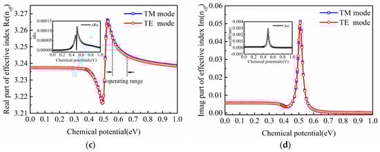 (a,b) are the electric fields of the TE and TM modes, respectively; (c,d) are the real- and imaginary-part of effective refractive index of TE and TM modes in the cases of different chemical potentials of graphene, respectively.