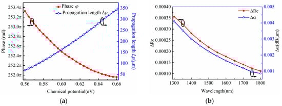 (a) Phase change and propagation length Lp in the range of 0.56 eV < μc < 0.66 eV, with the incident optical wavelength of 1550 nm; (b) Difference of the real- and imaginary-part of the effective refractive index between TE and TM modes in the case of different wavelengths.