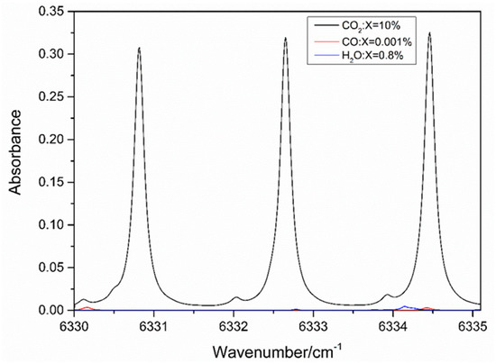 Simulated absorbance of CO2 (10%), CO (0.001%), and H2O (0.8%) from 6330–6335.5 cm−1 based on the HITRAN (High Resolution Transmission) database (298 K, 1 atm).