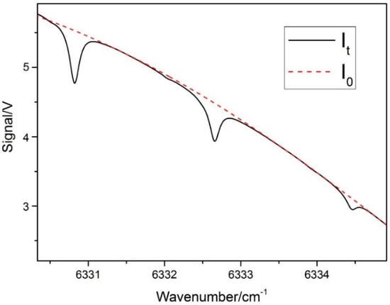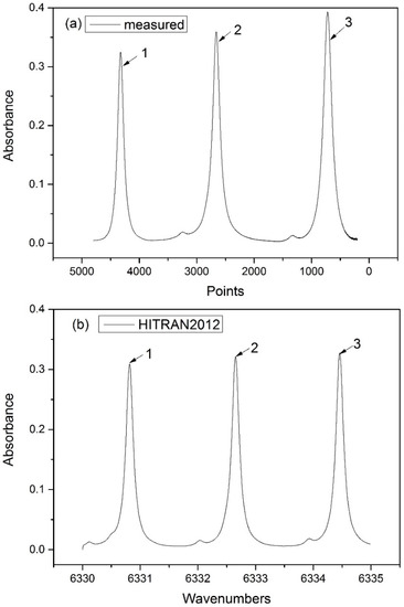 In this part, the direct absorption spectra with and without temperature corrections are compared to analyze the measurement accuracy by relative errors. The x-axis of measured spectral data were sampling points, which were time domain signals. The frequency calibration of the spectrum was required to convert the time domain to the frequency domain. The simulations based on HITRAN2012 were used to calibrate the frequency domain. As shown in Figure 3, three wavenumbers in HITRAN2012 correspond to three points in measured spectral. Therefore, the curvilinear equation of quadratic polynomial was obtained to convert the time domain to the frequency domain. Figure 4 plots the measured incident signal I0 and the direct absorption signals It for 10% CO2 at 318 K. The incident laser intensity I0 was inferred by third-order polynomial fit in the far-wing parts without absorption. The Lorentz profile was chosen to fit the line shape for improving accuracy due to the domination of Lorentzian component at 1 atm. After fitting, the logarithmic ln (It/I0) was integrated over the whole frequency domain to calculate the integrated absorbance A. Thus, the concentration X can be calculated from Equation (2), with line intensity S(T) obtained from Equation (4), total pressure P, and path length L as known parameters.