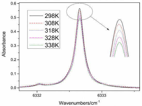 Absorption spectra of 16% CO2 in the 6331.8 to 6333.6 cm−1 spectral region at T = 298–338 K.