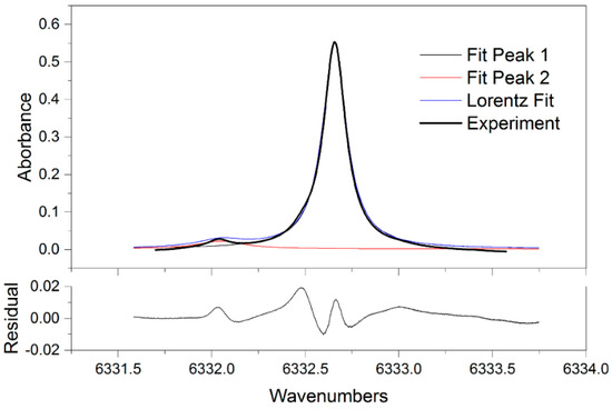 Figure 5 shows the measured absorption spectra of 16% CO2 in the 6331.8–6333.6 cm−1 spectral region at five different temperatures from 298 to 338K. The absorption signals in Figure 5 decrease with the increased temperature. Figure 6 plots the CO2 line shape near 6332.7 cm−1 (P = 1atm, T = 298 K, 10% CO2 in N2) well overlaid with the best-fit Lorentz profile. The obtained Lorentzian width of 0.15412 ± 0.0042 cm−1 was broadened by pressure and temperature. The residuals of the curve to data is shown in the bottom panel of Figure 6, showing that the fits are similar. Table 1 shows the relative errors of direct absorption from 298 to 338 K. The error of inferred concentration obtained from the spectroscopic measurement generally rises with the increase of temperature. At 308 K, the biggest relative error was up to 5.66%, which cannot meet the requirement of industrial application.