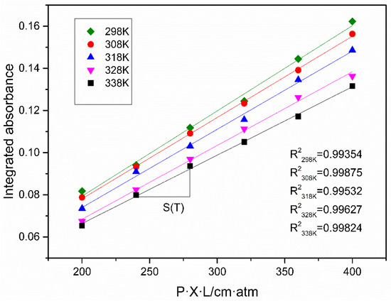 Integrated absorbance as a function of P·X·L (T = 298–338 K, P = 1 atm).