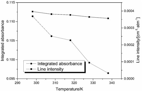 To further explore the cause of measurement errors, line intensities from the HITRAN database were compared with measured line intensities which are calculated by Equation (4). With a certain S(T), the obtained integrated absorbance A varies linearly with P·X·L where is the product of total pressure (P = 1 atm), absorption length (L = 2000 cm), and concentration (X = 10–20%, interval 2%). The relationship between A and P·X·L can be represented by a linear fitting and the slope of the fitting line is the intensity of the spectral line at the corresponding temperature from 298 K to 338 K, as depicted in Figure 7. Quality of the fit was very good in five temperatures, shown by R squared values from 0.99354 to 0.99875. As shown in Table 2, the calculated values show good agreement with the HITRAN values in variation tendency, but the former’s gradient decreases more with the temperature rising. The discrepancy indicates that a 3–10% change of line intensity leads to 1–6% change in the measured CO2 concentration.