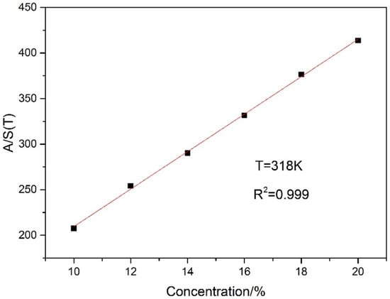 Figure 8 depicts that both the integrated absorbance and the line intensity of 14% CO2 decrease with the increase of temperature. The discrepancy leads to large errors in the concentration measurement, when the total pressure P and path length L are invariable. This information can be used to compensate these errors caused by change of temperature. According to the Equation (5), the least squares method is used for linear fitting between A/S(T) and concentration X at different temperatures. Figure 9 shows the result of linear fit between A/S(T) and concentration at T = 318 K. The fitting results show that the R squared value reaches 0.999, indicating a good linear relationship between A/S(T) and concentration.