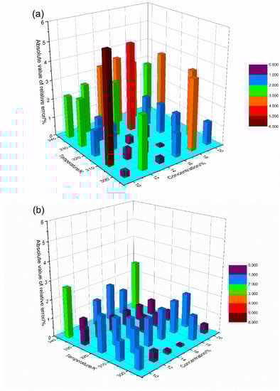 Absolute value of the relative error changes with concentration and temperature. (a) Before and (b) after compensation.