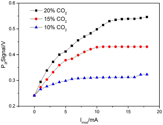 The WMS-2f peak signals of CO2 measured at different concentrations (10%–20%, interval 5%) and modulation currents (0 mA–18 mA, interval 1mA) are plotted in Figure 11. These measurements were conducted by controlling the gas flow controller and laser controller to maintain CO2 concentrations and modulation currents. According to the experimental results shown in Figure 11, with the choice of Imod of ~15 mA, the WMS-2f peak signals are stable at all concentrations. Hence, Imod = 15 mA was selected in this study.