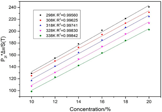 A linear fit of between P2f·Δνc/S(T) and concentration at different temperatures (298–338 K).