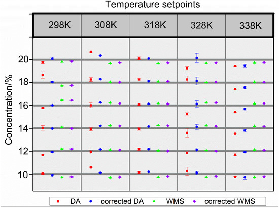 Figure 13 merges the inferred concentration values of all measurements at temperature 298–338 K and concentration 10–20%. The error bars represent the repeatability of three repeated experiments by SD. After compensation, the normal repeatability of CO2 values of DA and WMS were 5.55% and 1.79% at a SD (1σ). The mean relative error, which was caused by the uncertainties of temperature, pressure, and absorption length measurements, decreased from 3.06% to 1.17%. For the wavelength modulation, the mean relative errors were 1.44% and 1.20%, before and after compensation respectively. The relative standard deviation (RSD) for DA and WMS were 0.42% and 0.31%, while the maximum relative errors and detection limits (SNR = 1) for DA and WMS were 2.7% and 2.85%, 0.0084% and 0.0017%. It should be noted that the experiment in this study examined only high CO2 concentrations of 10–20%. As can be seen from the data, the effect on the direct absorption method was more outstanding.