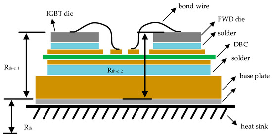 The switching device in the TC is usually a package module composed of an IGBT and an FWD. The fatigue of the switching device is mainly manifested by package failure, including two main forms: Wire liftoffs and solder layer cracking [4,5]. Wire liftoffs and solder layer cracking are caused by shear thermal stresses that are produced by temperature drift inside the device. In the intermittent operation of the device when it is turned on, heat is generated by current; when it is turned off, i.e., the current is cut off, the heat is dissipated. In such a way, the device is heated and cooled periodically. The internal temperature of the device (not only the IGBT junction temperature Tj, however also the temperature of each single layer) would increase and decrease accordingly. One switching device consists of multiple layers (as shown in Figure 1) with different coefficients of thermal expansion (CTE) of each layer.