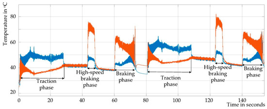 The internal temperature of the IGBTs and FWDs under the given operating conditions was obtained in an electro-thermal simulation of the TC model. In the simulation, the EMU went through two operating cycles. The simulation results are shown in Figure 7. The horizontal axis in Figure 7 is time, and the vertical axis is junction temperature. The switching device used is 1500 A/3300V, the switching frequency is 57 Hz~1000 Hz and the ambient temperature is 25 °C.