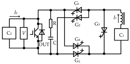 In Figure 2, G1 is auxiliary GTO, I1 is a fatigue current and I2 is used to calculate Tj. R and C form an absorption branch. If G1 is turned on, I1 flows through the IGBT part. If G1 is turned off, G2 provides the freewheeling route of I1. C1 and C2 produce I1 and I2, respectively. During the experiment, aging current I1 only flows through IGBT. So, it can be called SAFT.