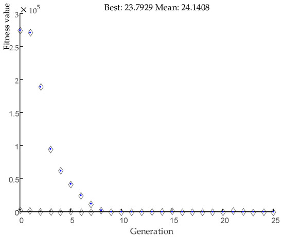 Taking λ and k as input variables and Equation (16) as fitness function, the algorithm is simulated by the GA toolbox of MATLAB. After 200 generations of the calculation, the optimal value is λ = 925830, k = 5.7629. The relationship curve between the optimal solution of each generation and the number of iterations of the algorithm is shown in Figure 12. In Figure 12, the horizontal axis is the number of generation and the vertical axis is fitness value. It can be seen that the algorithm converges basically after about 10 generations.