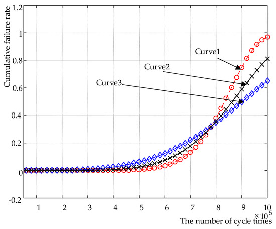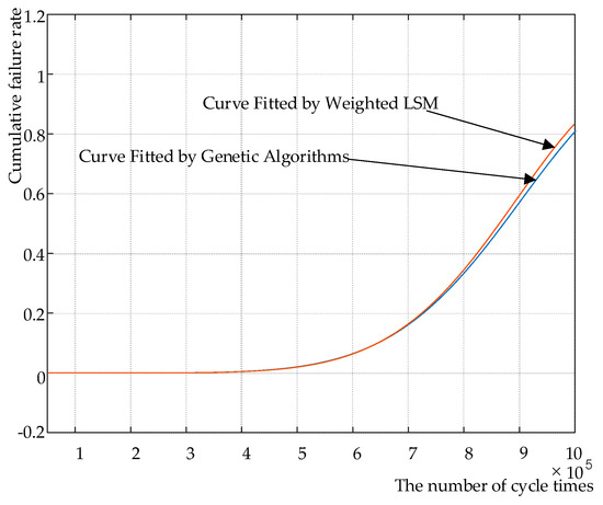 According to Figure 14, the curve of the function that was obtained by GA and curve 2 almost coincides in the interval of cycle number [4 × 105, 8 × 105], which proves that the weighted LSM can more accurately fit the distribution function. Compared with the GA, the computational complexity of weighted LSM is greatly reduced and the computation time is shortened by 27% compared with the GA. So, the weighted LSM is more suitable for fitting the distribution.