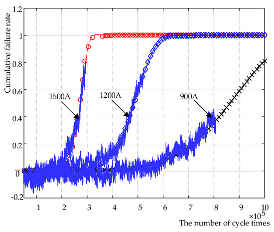 Different BAFTs are based on different I1, as shown in Figure 15. The horizontal axis in Figure 15 is the number of cycle times, and the vertical axis is cumulative failure rate. Under I1 at 1200 A and 900 A, the mathematical model between cumulative failure rate F and cycle number x is as follows:
