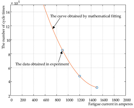 The data obtained in the experiment and the curve that was obtained by mathematical fitting is shown in Figure 16. The vertical axis in Figure 16 is the cycle counts that a DUT could survive before failure. The horizontal axis is the amplitude value of the test current. As shown in Figure 16, the obtained curve conforms to the obtained data very well.