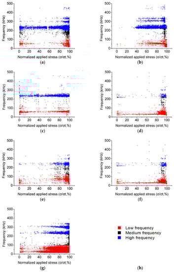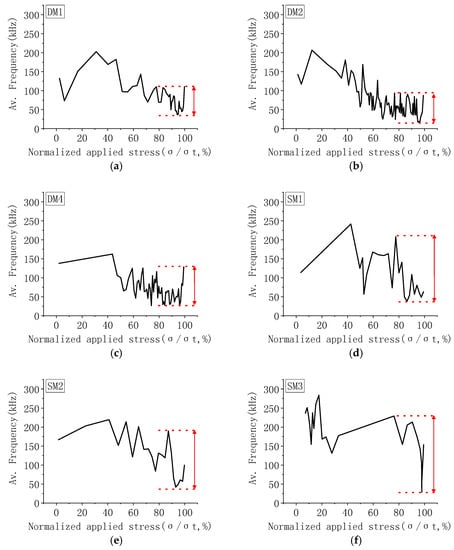 - Li, L.R.; Deng, J.H.; Zheng, L.; Liu, J.F. Dominant Frequency Characteristics of Acoustic Emissions in White Marble During Direct Tensile Tests. Rock Mech. Rock Eng. 2017, 50, 1337–1446. [Google Scholar] [CrossRef]