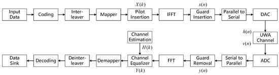 The main principle of OFDM is to transmit data stream in low rate through numerous orthogonal subcarriers simultaneously [25]. Figure 1 shows a typical end-to-end configuration of OFDM communication system. The transmitted data is modulated on N subcarriers and passed through the UWA channels.