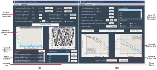 The user interface of simulation platform. (a) underwater acoustic (UWA) channel modelling. (b) OFDM channel estimation.