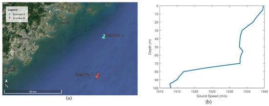 Control signals being transmitted from sea surface to underwater in shallow sea is one of the most commonly used applications of UWA communication. This article focuses on this application and analyses the factors in the estimation of UWA channel. There are two scenarios of shallow sea illustrated in Figure 5a with a range of 2 km from the southeast of Meizhou island in the East China Sea, which are selected to simulate on the proposed platform. Scenario A is located between 119.6590° E, 24.8385° N and 119.6689° E, 24.8541° N with an approximate flat sea bottom at the depth of about 70 m. Scenario B is located between 119.5708° E, 24.3453° N and 119.5609° E, 24.3297° N where the depth of sea bottom increases from 50 m to 80 m. The time of databases is set at noon on June 22. According to WOA2013, with an increase of sea depth, the temperature gradually decreases from 27.9 °C to 16.7 °C and the salinity slowly increases from 33.5 psu to 34.2 psu. The SSP calculated by temperature and salinity is shown in Figure 5b, varying from 1513 m/s to 1540 m/s. In addition, the average SWH can also be found in Aviso+ with a value of 1.29 m. Three simulations are set to model channels in different receiving depth, sea bottom boundaries, and sea surface boundaries, respectively, and the influence on channel estimation performance is analysed afterwards. The detailed simulation parameters are tabulated in Table 1.