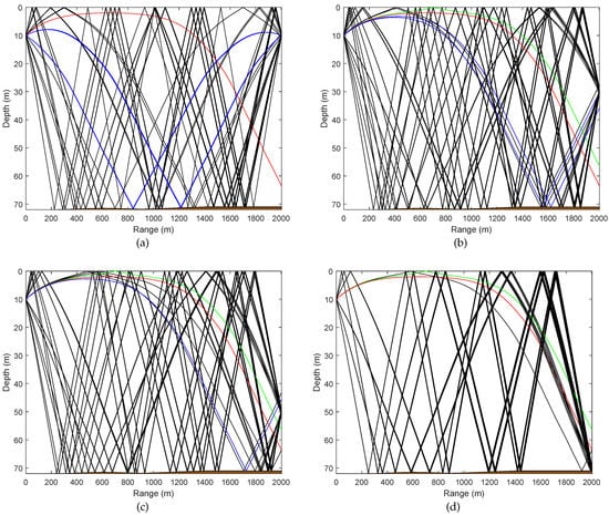 Eigenrays of channel with different receiving depth. The color of lines indicates whether eigenrays hit surface boundary or bottom boundary of the sea. Receiving depth of each figure: (a) 10 m; (b) 30 m; (c) 50 m; (d) 70 m.